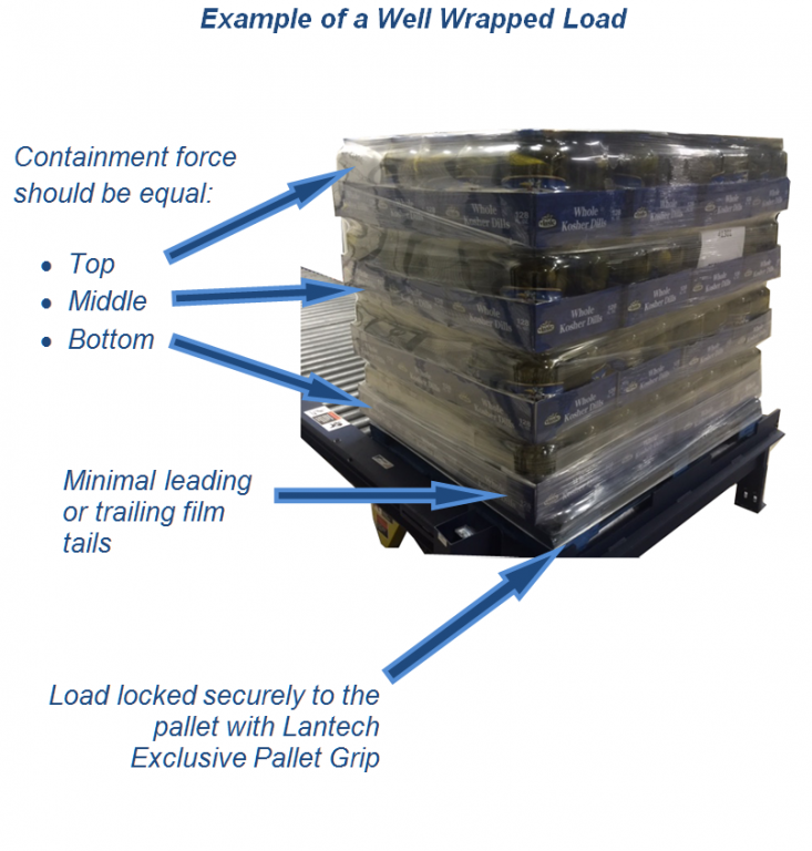 The pictures below show the original wrap pattern the customer was using to secure the load as well as the load after Technical Packaging Systems conducted its containment force analysis. It was originally determined that the top and bottom portions of the load were unstable. The corner protectors and banding pattern in the original load offer very little support in this application. Technical Packaging Systems was able to analyze the desired pallet load and conduct its containment force analysis to maximize the load containment force. Once removing the corner protectors and banding, we were able to get an above average containment profile by increasing the film gauge. This result allows for a faster packaging process while also decreasing the cost to the user. The implementation of this plan significantly reduced the risk of damage to product in shipment by eliminating the variation in containment forces. It also improved overall packaging / unitization quality with standards and a process for monitoring adherence to the standards. Technical Packaging Systems reduced the labor and wrap cycle time by eliminating bands and corner boards, while still achieving higher containment profile values using a thicker gauge film.